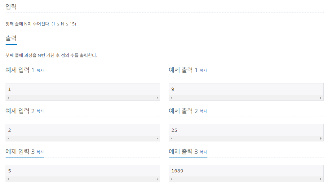 이제 n번 시행 후 나온 큰 정사각형에서 한 변에 있는 점의 개수를 알았으니, 이를 제곱해주면 모든 점의 수를 구할 수 있다.