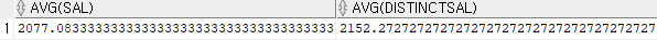 - AVG( [DISTINCT, 또는 ALL 또는 아무값도 지정하지 않음] [평균을 구할 열이나 연산자, 함수를 사용한 데이터] )