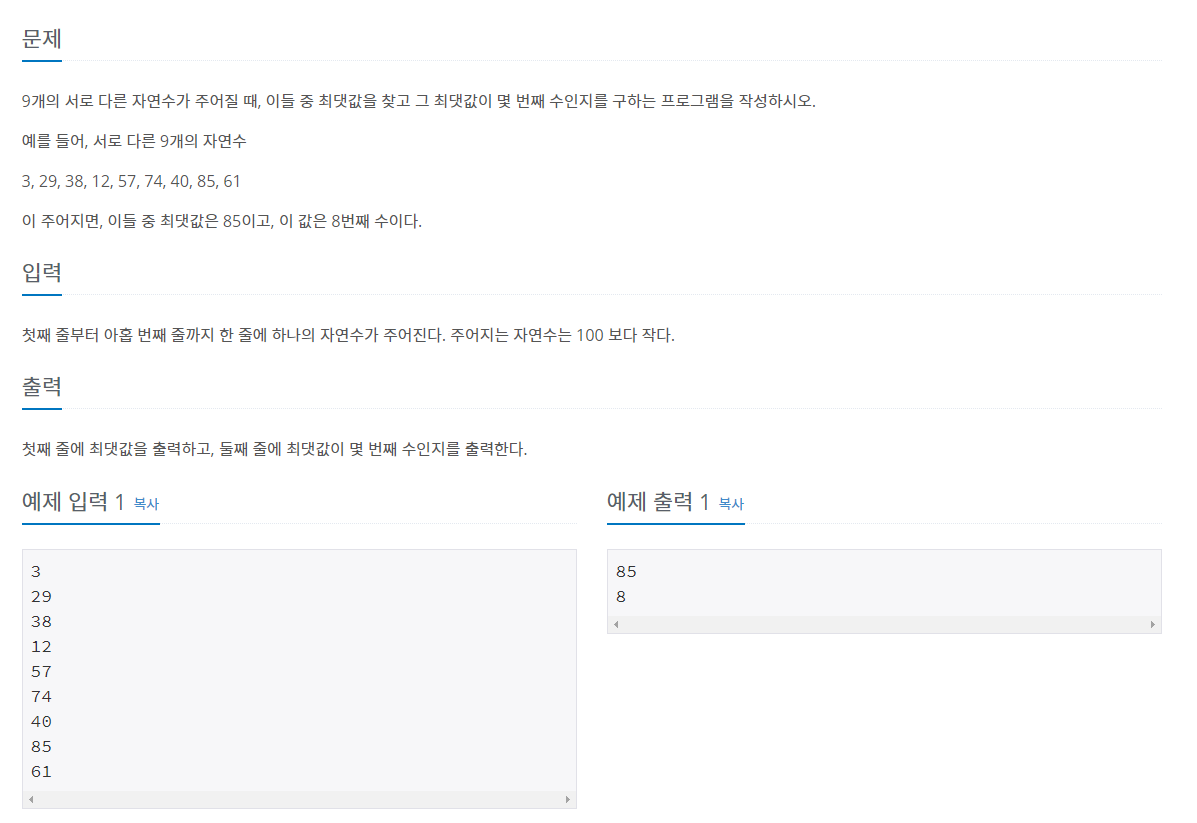 정수 10개를 입력받아 이를 42로 나눈 나머지 중 서로 다른 수가 몇개인가를 구하는 문제이다. 어떤 수를 42로 나누면 나머지가 0~41까지 나올 수 있으므로 이를 저장하는 배열 a[42]를 만들어 놓은 후 나머지가 n이라면 a[n]의 수를 1 증가시키는 방법으로 0부터 41까지의 나머지를 찾을 수 있겠다. 여기서는 서로 다른 수의 갯수를 찾는 것이므로 a[n]이 1이 아닌경우에만 1을 넣어주고 모든 수를 입력 받은 후에는 for문을 이용하여 a[ ] 배열에서 값이 1인 것들만 찾아서 카운트해주면 된다. #include int main() { int n; int a[42] = { 0 }; int count = 0; for (int i = 1; i