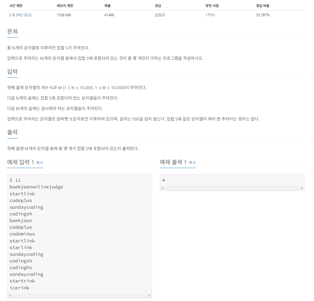 [Java] 백준알고리즘 #14425 문자열 집합 N개의 문자열을 입력받고 이를 S라는 집합이라 할 때, M개의 문자열 중 몇 개가 집합 S에 포함되는가를 찾는 문제. HashSet을 이용하면 간단히 해결할 수 있을 듯 하다. 2023.10.17 - [Java/개념정리] - [Java] HashSet 에 대해 알아보자 [Java] HashSet 에 대해 알아보자 Set Interface 기본적으로 Set혹은 Set계열을 구현하는 클래스들은 다음과 같은 공통점이 있다. 중복되는 요소(원소)를 허용하지 않는다. 저장 순서를 유지하지 않는다. (LinkedHashSet 만 예외) HashSet HashS sehyeok.tistory.com 먼저 n과 m을 입력받는다. Scanner로 입력받는다면 nextInt()로 간단히 입력받을 수 있지만 BufferedR.. Java/백준알고리즘 2023.10.26