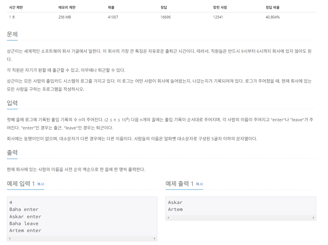 [Java] 백준알고리즘 #7785 회사에 있는 사람 이름과 출입여부를 공백을 두고 입력받고, enter라면 출근, leave 라면 퇴근으로 할 때, 모든 입력이 끝난 후 회사에 남아 있는 사람의 이름을 출력하는 문제. 사전순의 역순으로 출력한다는 점에 주의할 것. Hashset을 이용하여 회사원들의 출입관리를 하면 될 듯 하다. 2023.10.17 - [Java/개념정리] - [Java] HashSet 에 대해 알아보자 [Java] HashSet 에 대해 알아보자 Set Interface 기본적으로 Set혹은 Set계열을 구현하는 클래스들은 다음과 같은 공통점이 있다. 중복되는 요소(원소)를 허용하지 않는다. 저장 순서를 유지하지 않는다. (LinkedHashSet 만 예외) HashSet HashS sehyeok.tistory.com 문자열 분리는 St.. Java/백준알고리즘 2023.10.26