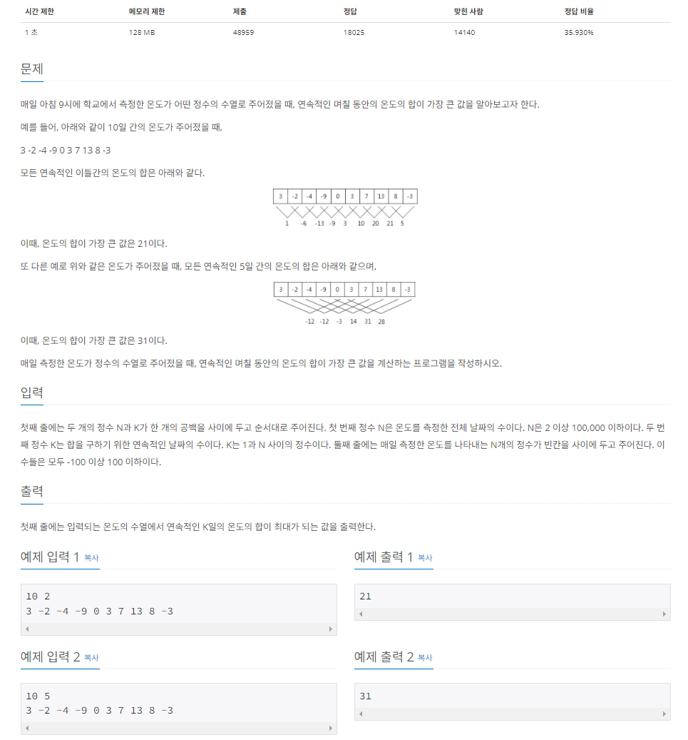 [Java] 백준알고리즘 #2559 수열 앞서 풀었던 누적합 문제와 유사한 문제이다. 2023.12.12 - [Java/백준알고리즘] - [Java] 백준알고리즘 #11659 구간 합 구하기 4 누적합 문제와 같이 배열에 누적합을 저장해주고 int n = sc.nextInt(); int k = sc.nextInt(); int[] temp = new int[n + 1]; temp[0] = 0; // 배열의 첫번째(0번째)는 0 for (int i = 1; i Java/백준알고리즘 2023.12.13