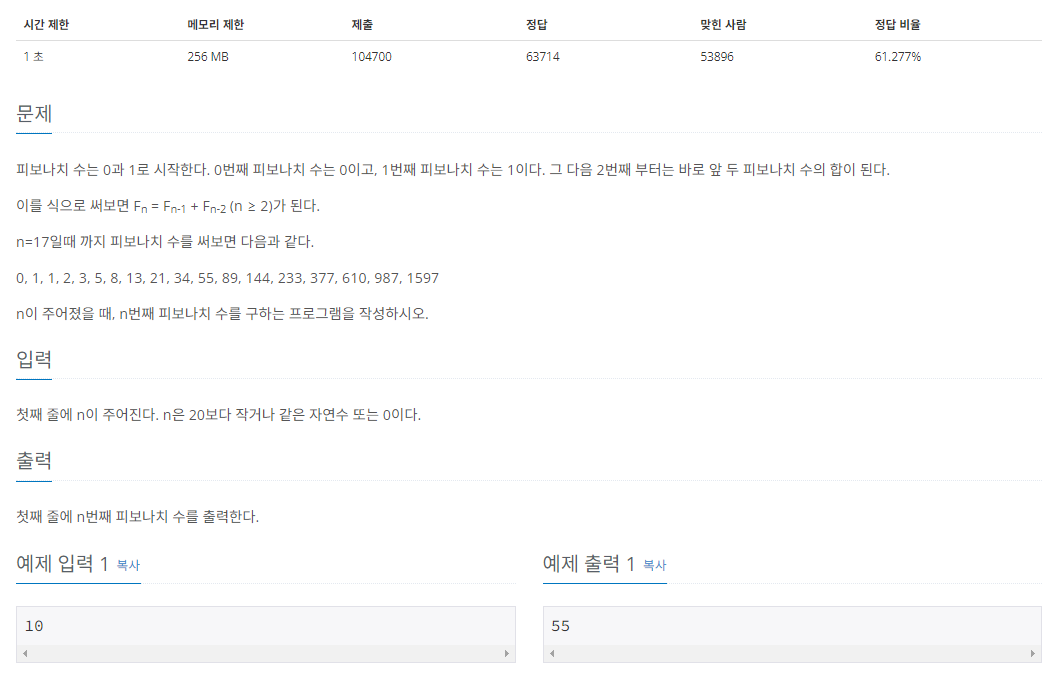 [Java] 백준알고리즘 #10870 피보나치 수 5 재귀함수를 이용해서 피보나치 수를 구하는 방법. 피보나치 수는 0번째 수가 0, 1번째 수가 1, 2번째 수부터는 0번째 수 + 1번째 수 ... 과정을 거치므로 재귀함수를 이용하기에 적합하다. 재귀함수를 이용하여 팩토리얼을 구했을 때 처럼 fibo함수를 이용한다면 fibo(n) = fibo(n-1) + fibo(n-2) 가 될 것이다. 위 과정을 반복하다 보면, fibo(0), fibo(-1) ... 처럼 무한히 끝나지 않을 수 있으니, 종료 조건을 명시해주어야 한다. fibo(n-1) + fibo(n-2)가 각각 fibo(1)과 fibo(0) 일 때, 이 루프가 끝나게 되므로 fibo(1)은 1, fibo(0)은 0으로 명시해준다. (종료조건 충족) 전체 코드는 다음과 같다. // 해설참조 : seh.. Java/백준알고리즘 2023.10.19