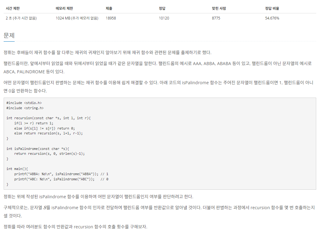 [Java] 백준알고리즘 #25501 재귀의 귀재 주어진 함수들을 이용해 입력받은 문자가 팰린드롬인지 확인하고, isPalindrome 함수 호출 결과 및 recursion 함수의 호출 횟수를 구하는 문제이다. recursion함수의 호출 횟수는 전역 변수를 통해 간단히 구할 수 있다. 전역 변수 count를 선언해주고, recusrion 함수 내에서 count를 증가시키는 구문만 넣어주면 쉽게 도출할 수 있다. 전체 코드는 다음과 같다. // 해설참조 : sehyeok.tistory.com import java.io.BufferedReader; import java.io.IOException; import java.io.InputStreamReader; public class Main { static int count = 0; // recursion .. Java/백준알고리즘 2023.10.23