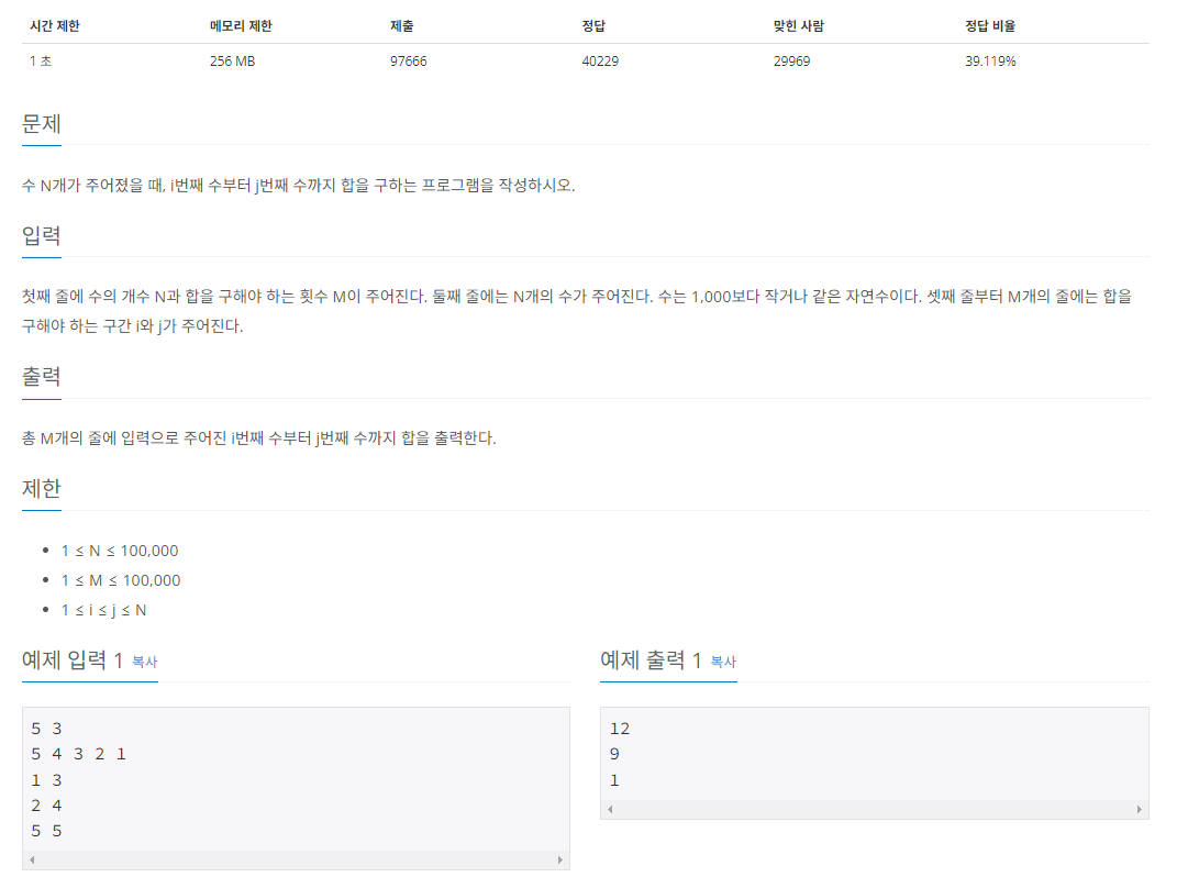 [Java] 백준알고리즘 #11659 구간 합 구하기 4 주어진 수들의 구간합을 구하는 문제. 단순히 생각하면 다음과 같은 풀이를 구할 수 있다. // 해설참조 : sehyeok.tistory.com import java.io.IOException; import java.util.Scanner; public class Main { public static void main(String args[]) throws IOException { Scanner sc = new Scanner(System.in); int n = sc.nextInt(); int m = sc.nextInt(); int[] num = new int[n]; for (int i = 0; i < n; i++) { num[i] = sc.nextInt(); } for (int i = 0; i < m; i.. Java/백준알고리즘 2023.12.12