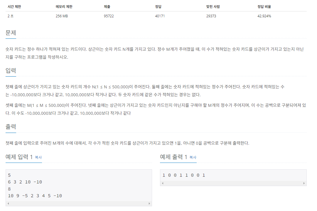 [Java] 백준알고리즘 #10815 숫자 카드 숫자카드를 가지고 있다면 1, 아니라면 0을 출력하는 문제. HashSet 기능을 이용한다면 간단히 해결할 수 있다. 2023.10.17 - [Java/개념정리] - [Java] HashSet 에 대해 알아보자 [Java] HashSet 에 대해 알아보자 Set Interface 기본적으로 Set혹은 Set계열을 구현하는 클래스들은 다음과 같은 공통점이 있다. 중복되는 요소(원소)를 허용하지 않는다. 저장 순서를 유지하지 않는다. (LinkedHashSet 만 예외) HashSet HashS sehyeok.tistory.com 첫 입력에서 add()메소드로 해쉬에 추가한 후, 두번째 입력에서 contains() 메소드를 이용해 해당 숫자를 포함하는지 아닌지를 판단하여 출력하면 된다. 두 가지 방식으로 해.. Java/백준알고리즘 2023.10.25