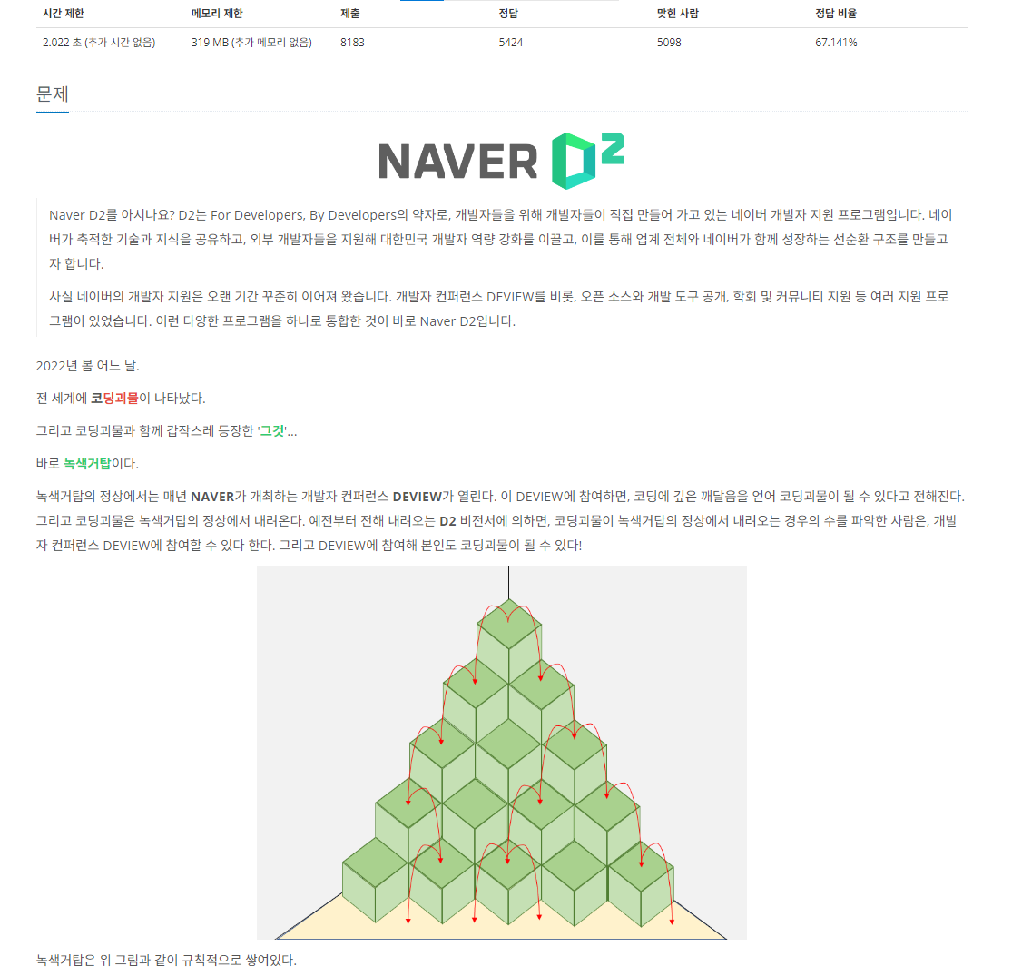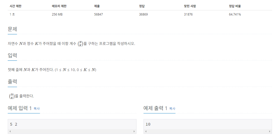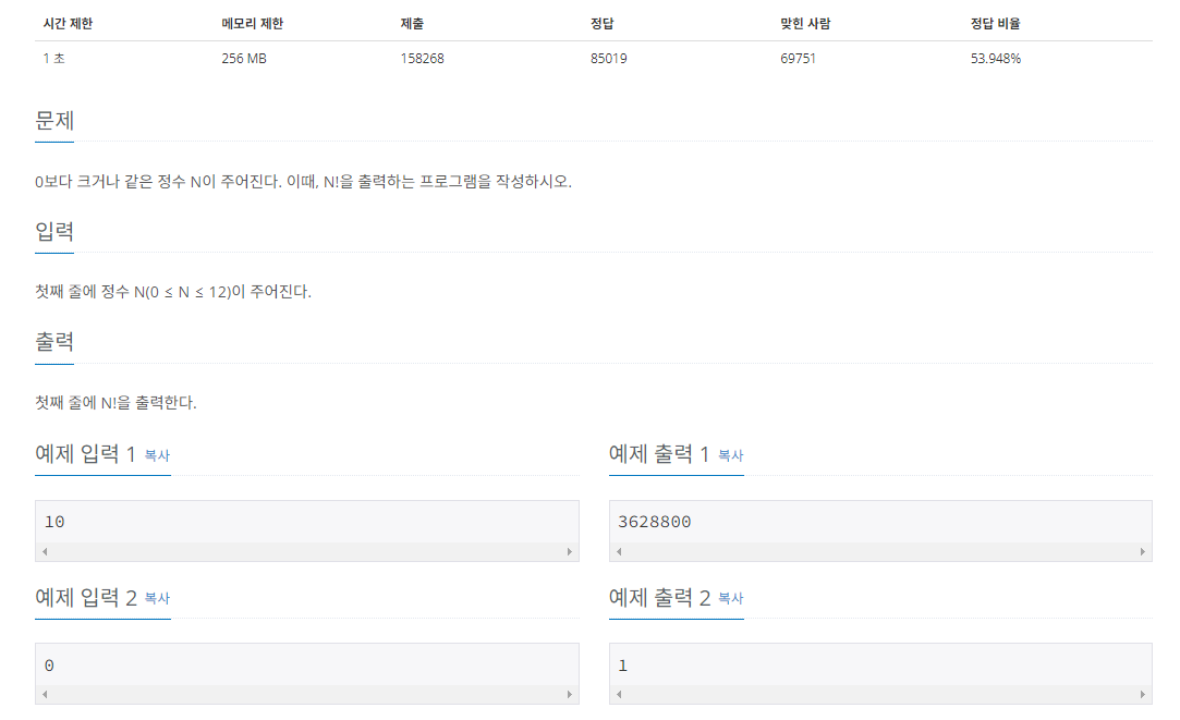 재귀함수를 사용해 팩토리얼 값을 계산하는 문제. n! 은 n x (n-1)! 로 나타낼 수 있고, (n-1)! 은 다시 (n-1) x (n-2)! 로 나타낼 수 있다. 여기서 !(팩토리얼)을 어떤 함수 fact라고 한다면, n!은 fact(n)이고, 이는 n x fact(n-1)이 될 것이다. 위 fact함수에서 n이 1이 될 경우 fact(1) 은 1 x fact(0) 가 되어 결과가 0이 되어버릴 것이다. 뿐만 아니라, 위 과정을 반복하다보면 n x (n-1) x ... x 2 x 1 x 0 이 될 것이고, 이는 음수로 무한히 이어지게 된다. 따라서 재귀함수에서는 종료조건을 반드시 명시해주어야 한다. 때문에 조건문을 통해 n이 1보다 큰 경우로 한정하고, 1 이하가 되는 경우에는 x 1로 자기 자신을..