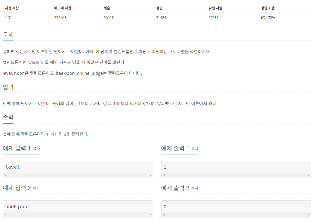 팰린드롬(palindrome)은 거꾸로 읽어도 제대로 읽는 것과 같은 문장이나 낱말, 숫자, 문자열(sequence of characters) 등이다. 입력 받은 문자열이 팰린드롬인지 아닌지 판별하는 문제. 먼저 전체 코드를 보자 import java.util.Scanner; public class Main { public static void main(String[] args) { Scanner sc = new Scanner(System.in); String a = sc.next(); String tmp = ""; for (int i = a.length() - 1; i >= 0; i--) { tmp = tmp + a.charAt(i); } if (tmp.equals(a)) { System.out.pri..