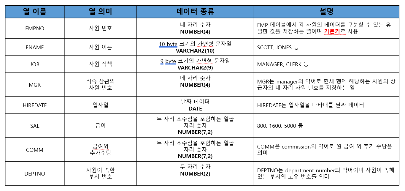 WHERE 절은 조회할 행을 선별하기 위한 조건식이다. 조건식의 결과 값이 true인 행만 출력한다. 즉 내가 원하는 열 값만 출력하거나 수정할 수 있게 해준다. 간단한 예시를 보자 select * from emp where deptno = 30; emp 테이블의 모든 정보를 조회하지만 where 절을 통해서 deptno(부서번호) 가 30인 정보만 출력하도록 했다. 이와 같이 where 뒤에는 조건식이 들어와야 하므로 연산자가 잇따르는 경우가 많다. 이 연산자에 대해 알아보도록 하자 1) 논리 연산자 - A AND B : A와 B 조건을 모두 만족하는 것 - A OR B : A 또는 B의 조건을 만족하는 것 (둘중에 하나라도 만족하는 것) - NOT A: 논리 부정 연산자. (A가 아닌 것) AND 연..